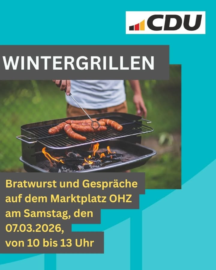 Wintergrillen Das Wintergrillen hat Tradition im CDU-Stadtverband. Seit über 20 Jahren trifft man sich zum Grillen und für Gespräche auf dem Marktplatz - bei jedem Wetter! In diesem Jahr meint es das Wetter offenbar gut mit uns!Kommen Sie am kommenden Samstag zwischen 10 und 13 Uhr auf dem Kirchebvorplatz vorbei und lassen Sie uns über die aktuellen Herausforderungen unserer Stadt sprechen. Lernen Sie auch unsere Fraktionsmitglieder und Bürgermeisterkandidatin Marie Jordan kennen!#ohz #osterholzscharmbeck #wintergrillen